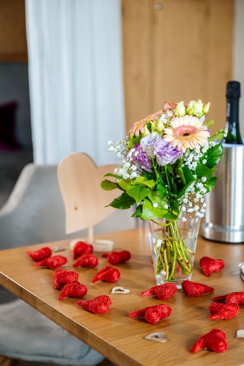 Order your romantic arrangement online right here. Please order at least 7 days in advance so that we can prepare everything according to your wishes. We will prepare the arrangement on the desired day in your room / chalet.